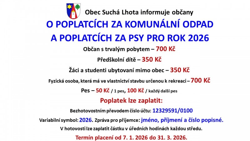 Obec Suchá Lhota informuje občany o poplatcích za komunální odpad pro rok 2026.