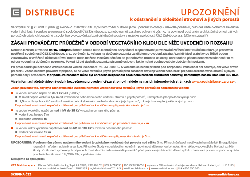 Výzvy k ořezům stromoví - ČEZ Distribuce, a. s